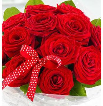 A gorgeous aqua pack hand tie bouquet of a dozen red Roses skillfully arranged and simply perfect for Valentine's Day.