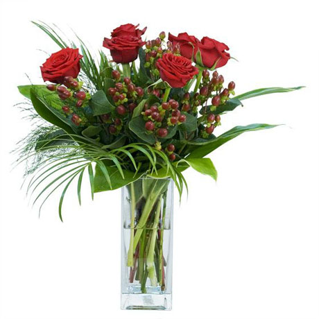 6 Gorgeous Red Roses hand tied with Hypericum berry and foliages.