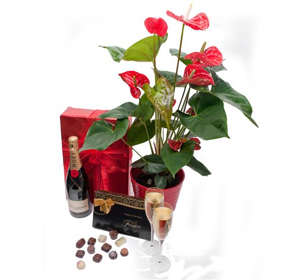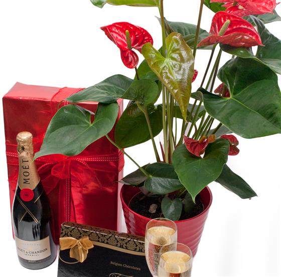 Anthirium Red Potted, Moet & Chandon and Chocolates 125g zoom 2Anthirium Red Potted, Moet & Chandon and Chocolates 125g zoom 3