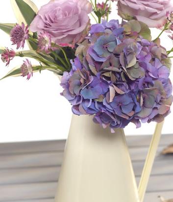 A cream enamel jug arrangement of delicate purple and pink flower favourites: purple Hydrangea, lilac Roses and pink Astrantia.