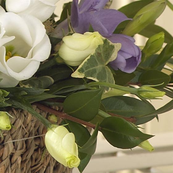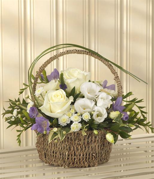 Send your congratulations with this beautiful basket arrangement, perfect for a delivery to a hospital. Containing Roses, Lisianthus, fragrant Freesia and spray Chrysanthemums.