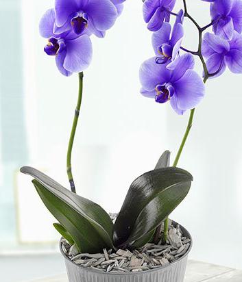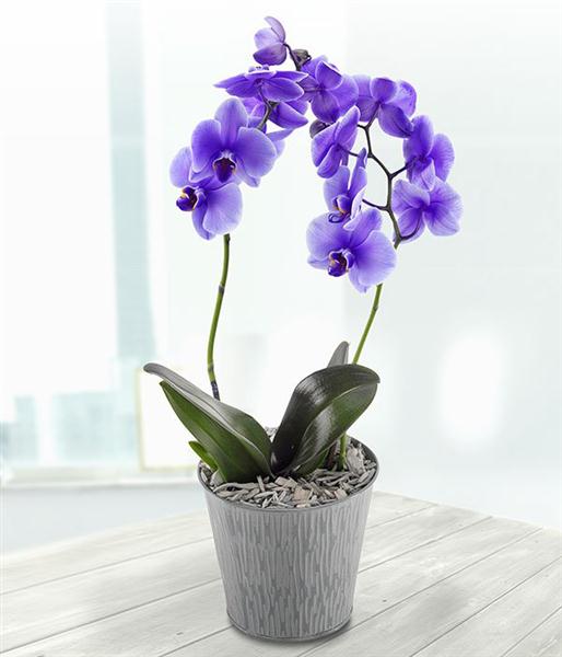 An elegant and distinctive purple Phalaenopsis Orchid Plant in a grey metallic pot. This rare and unusal orchid will require a lead time of one week in advance please .