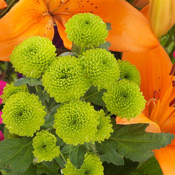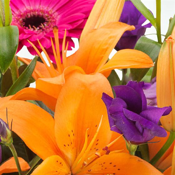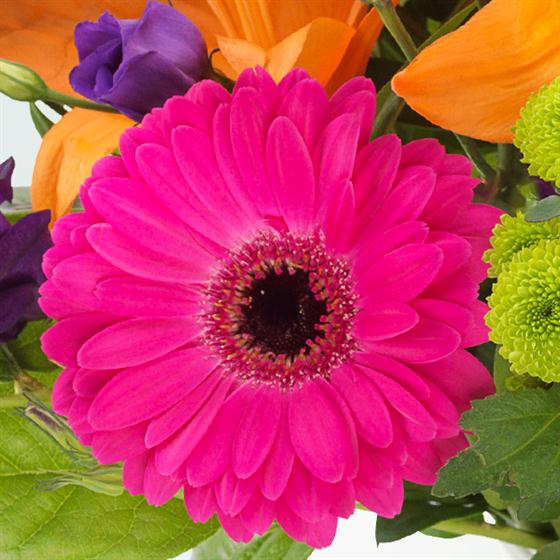 An eye catching bouquet that's simply bursting with colour. Orange Lilies, cerise Gerberas, purple Lisianthus and green Spray Chrysanthemums.