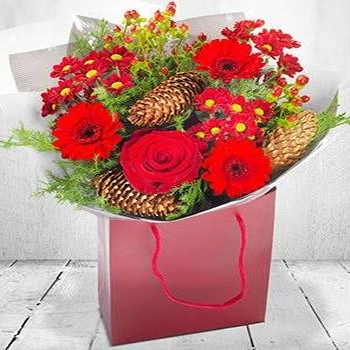 Warm up this Christmas with our beautiful Christmas Classic bouquet. This hand crafted display is hand delivered in warming shades of red and burgundy and hand painted pine kernels .Delivered in a florist's presentation bag and made in an aqua pack hand tie presentation .