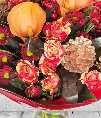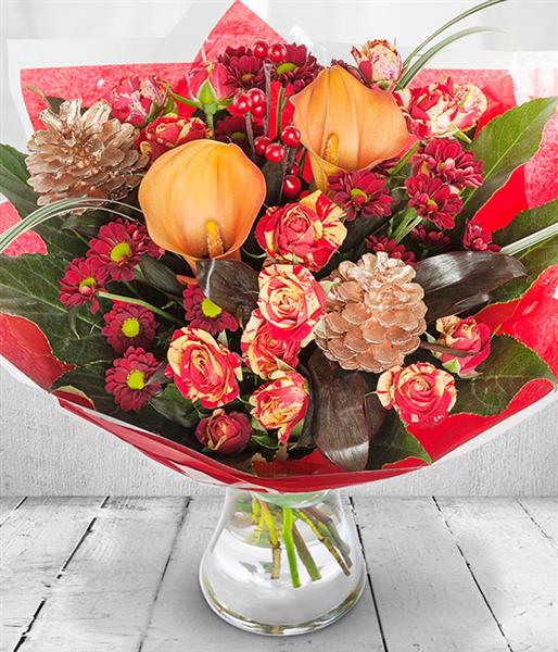 Make Christmas complete with this sumptuous, warm bouquet of red santini, mango calla lilies ( zanthia ) and spray roses accompanied by berries and a sparkling pine cone.Presentation is aqqu pack hand tie in a floristry presentation bag .