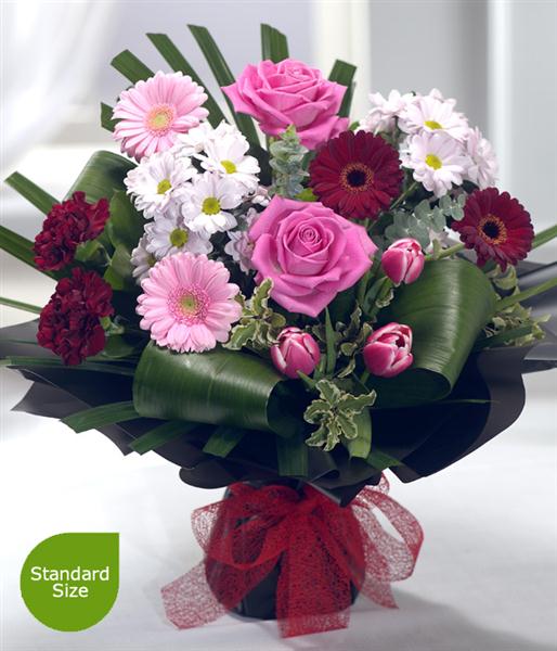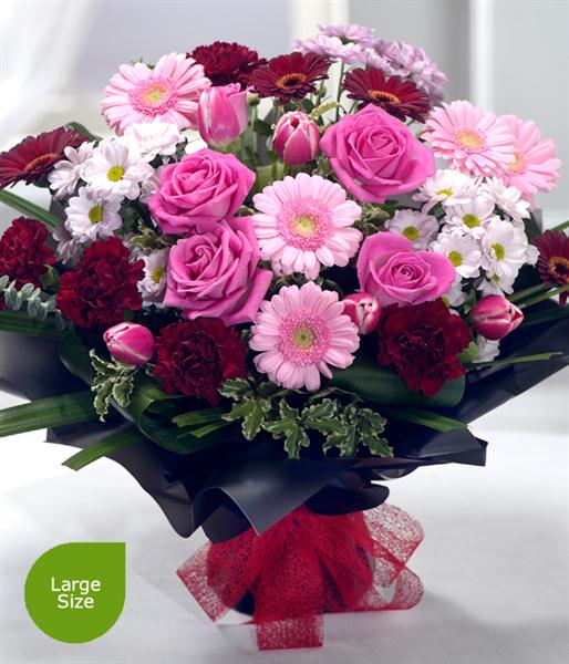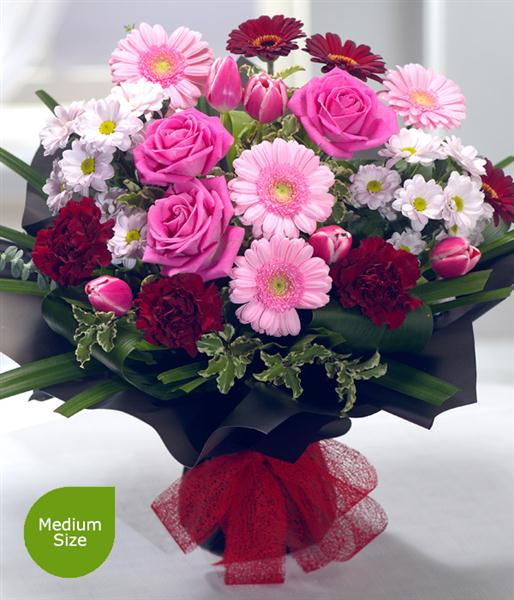 An exquisitely designed Valentine's bouquet. Delicate soft pink Germini and Carnations are neatly nestled alongside beautiful pink Tulips and Roses. Deep velvet red Carnations and Germini perfect the splendour of this bouquet.