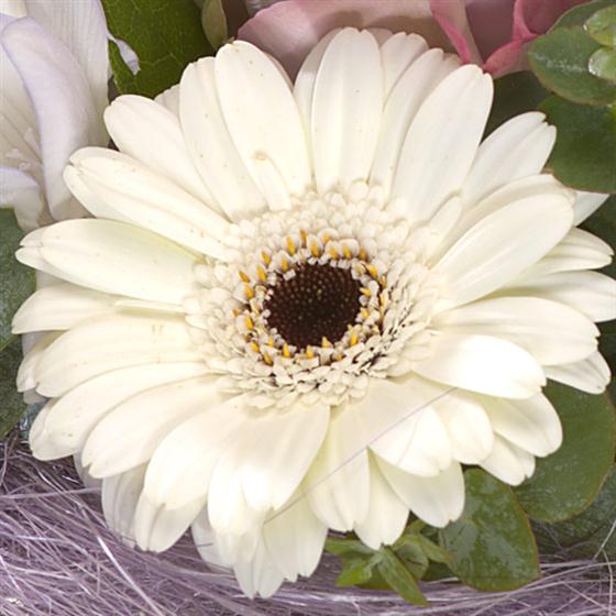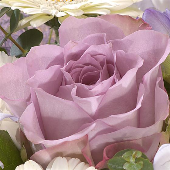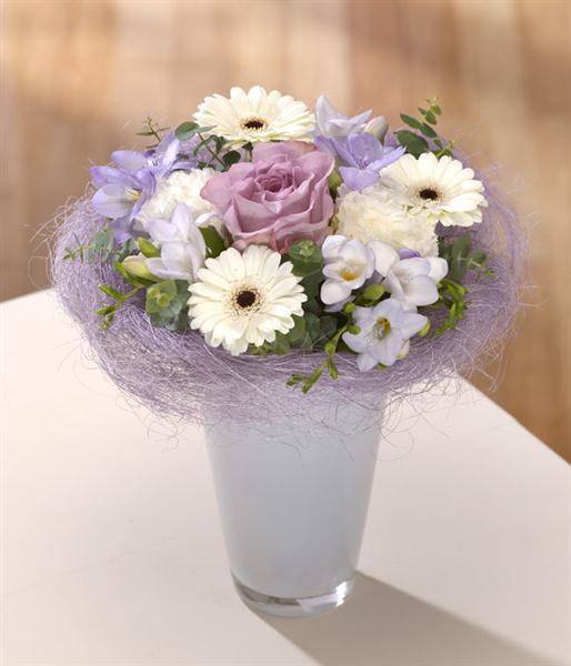 A single lavender Rose is central to this vase arrangement which sits in a sisal collar with lavender Gerbera, white Carnation, Germini and scented Freesia.