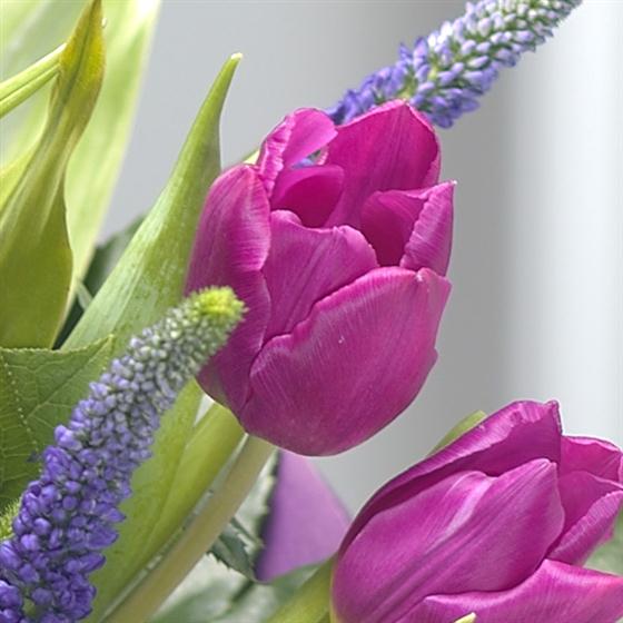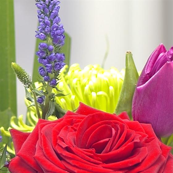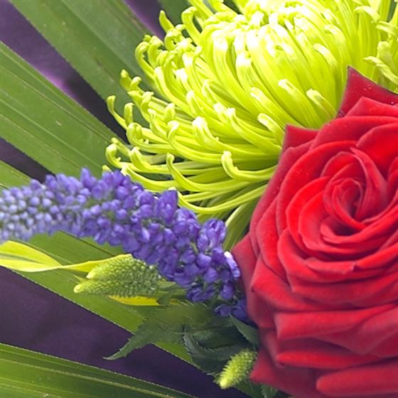 A vibrant and totally gorgeous Valentines gift vase arrangement. Rich Red roses sit perfectly alongside bright green Bloom Chrysanthemums, striking purple Veronica and Tulips.