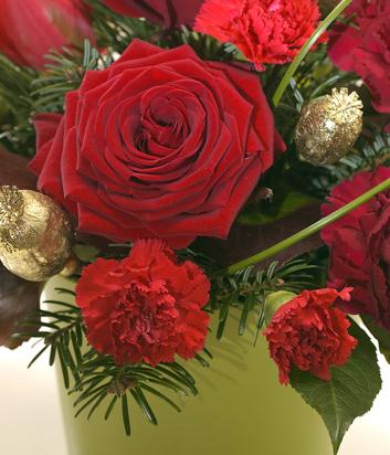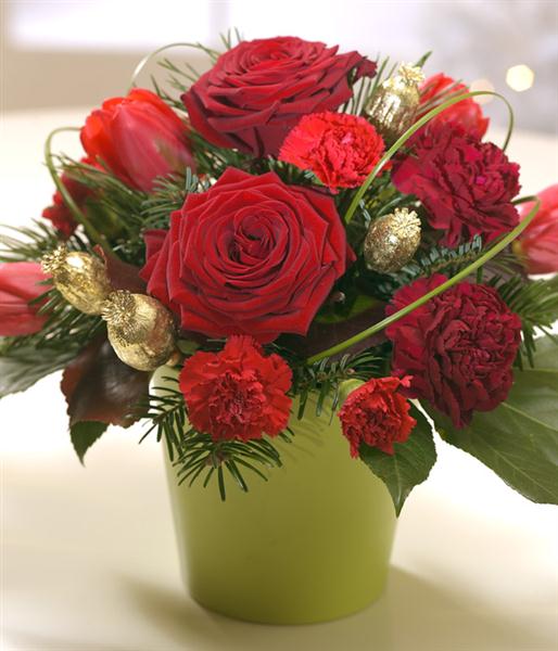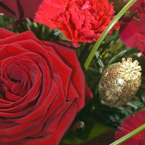 Magnificent red Roses, beautiful ruby red Tulips, deep red velvety Carnations and gold coloured Poppy heads, nestled in amongst winter foliage. A stunning Christmas flower arrangement.