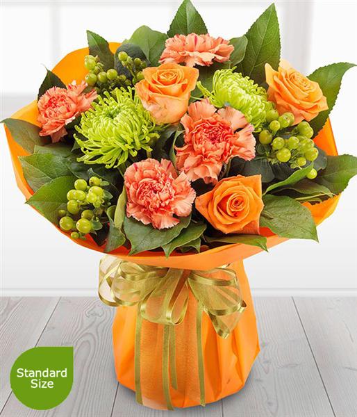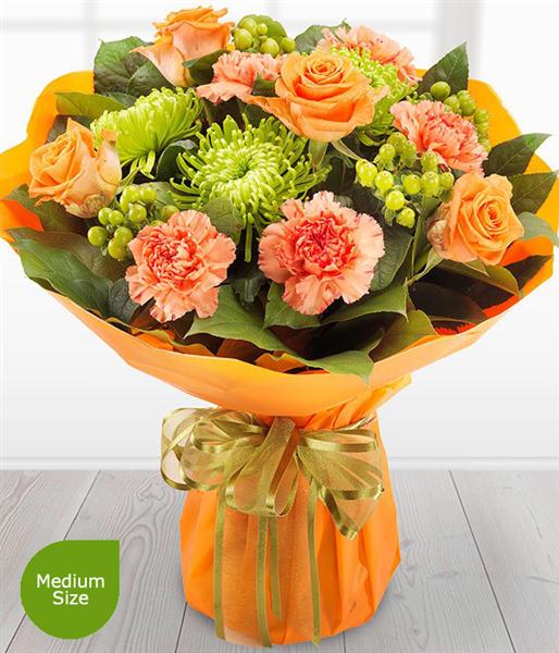 Includes Orange Roses, Green Chrysanthemums, Orange Carnations, Green Hypericum Berry, Aralia Leaf, Salal.