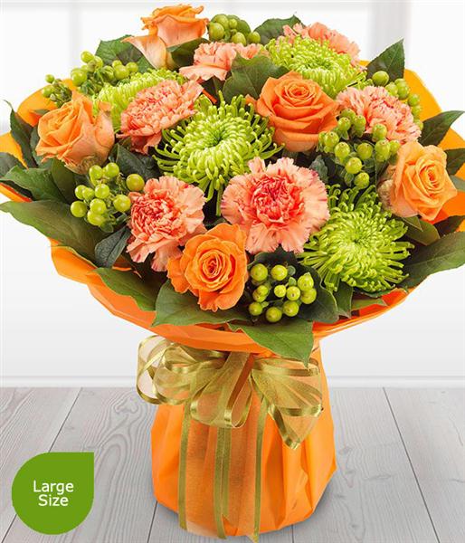 A simply sumptuous arrangement of orange Roses & Carnations mixed with luscious green Chrysanthemums and Hypericum Berries. Absolutely stunning.