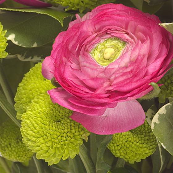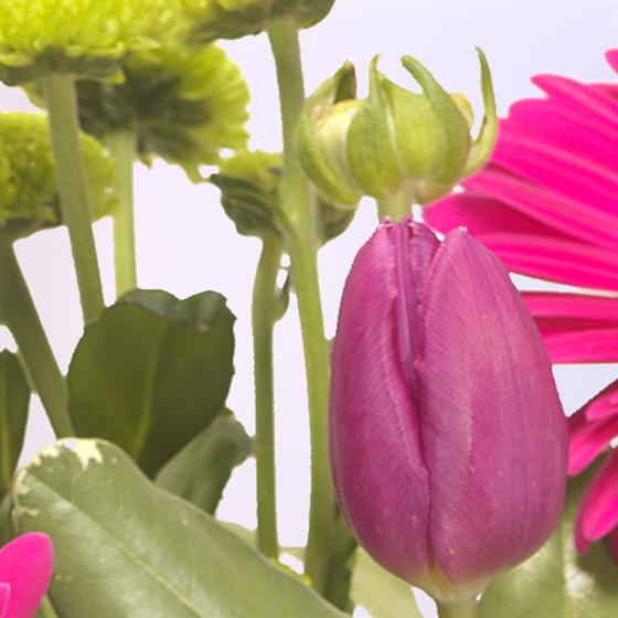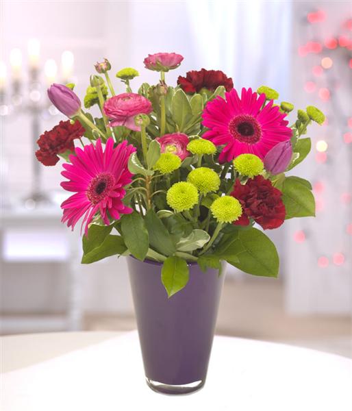 A beautiful bouquet of rich flowers featuring cerise Gerbera, Carnations, Ranunculus, Tulips and Chrysanthemums. The perfect gift for someone who likes to arrange flowers. Vase not included but can be bought separately to enhance the gift.