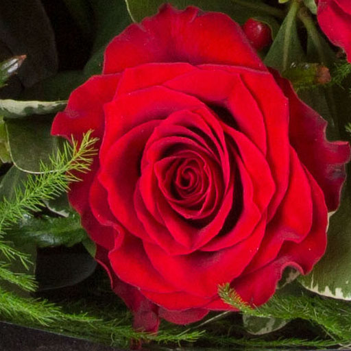 12 long stemmed velvety red roses mingled with mixed foliage and hypericum berries, presented with a complementary wrap.