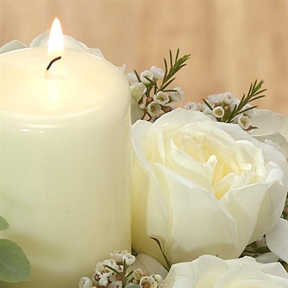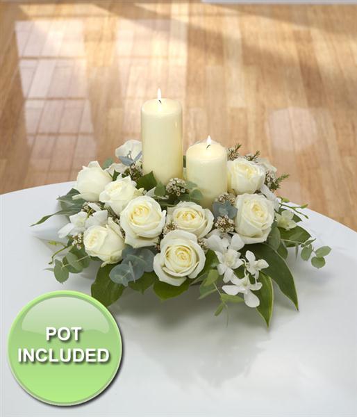 A special white centre-piece with Roses and Dendrobium Orchids, all in white with candles.