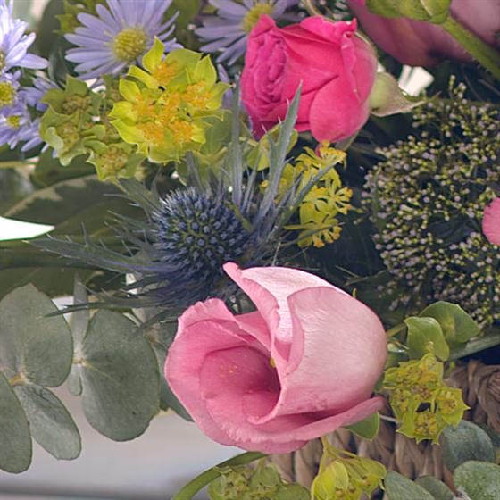 A fragrant country basket arrangement , that looks like you have just picked the roses, lisianthus , eryngium , sedum or trachelium asters yourself from an English country garden . Easy to maintain and offering great longevity . The basket design may vary according to the season .