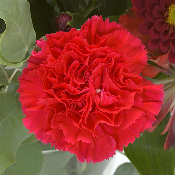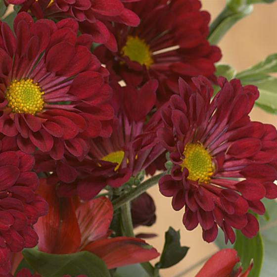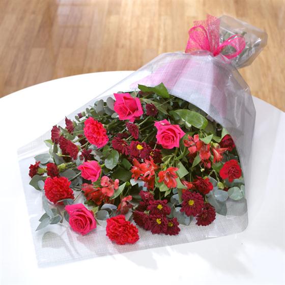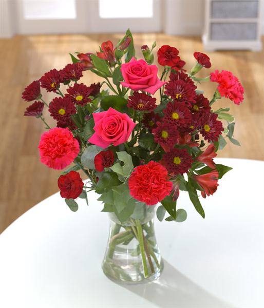 Cerise pink Roses with burgundy Chrysanthemums and bright Alstroemeria for a hot and spicy bouquet.