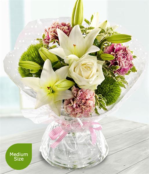 A simply stunning Mother's Day Bouquet. White Roses and Lilies married with pretty pink Carnations are neatly nestled in a glorious array of green foliage. Beautiful vases are available to add to your gift from our glassware selection .
