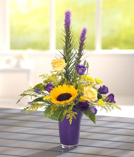 A bright, colouful summery container arrangement of roses, lisianthus and sunflowers. Perfect for a garden party. Striking and modern , a perfect gift for a loved home .