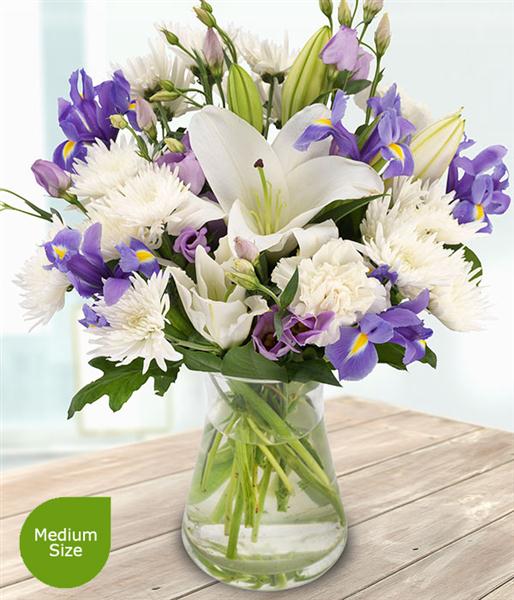 An incredibly beautiful bouquet of white Lilies, Spray Chrysanthemums and Carnations mixed with blue Irises and lilac Lisianthuses.