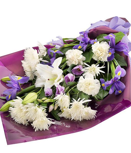 includes White Lilys, Blue Iris, Lilac Lisianthus, White Spray Chrysanthemums, White Carnations, Salal.