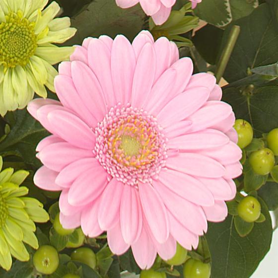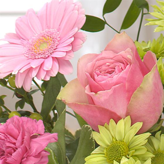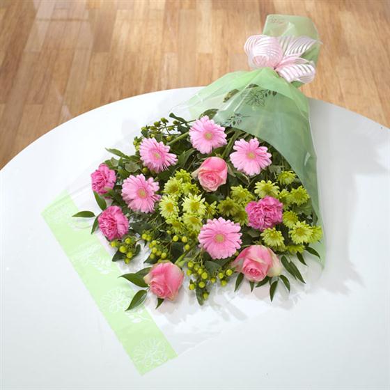 A classic bouquet of pink Roses, Germini and spray Chrysanthemums. Add a beautiful vase from our selection of glassware gifts to compliment this beautiful bouquet .