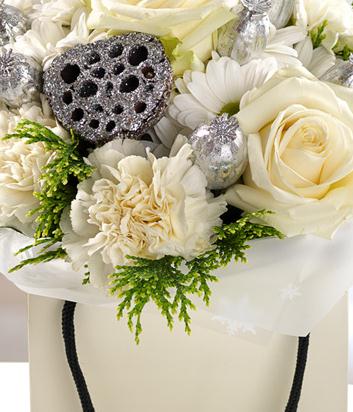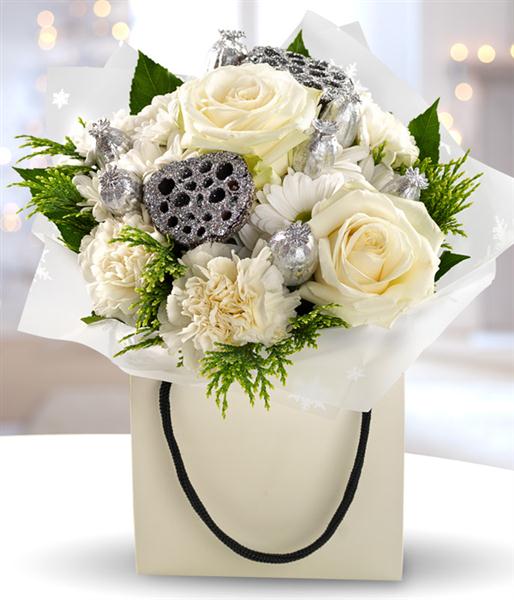 Ice white Roses, Carnations and Chrysanthemum are exquisitely combined with dried silver Poppies and Lotus seed heads. A stunning Christmas gift bag Bouquet.
