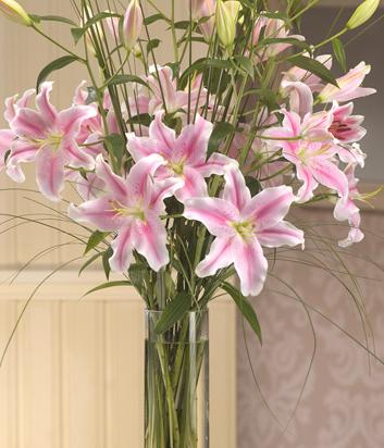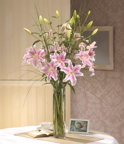 Make a statement with this luxury Lily vase. This stunning gift is complete with Lilies, foliage and a beautiful slender vase that can be re used.