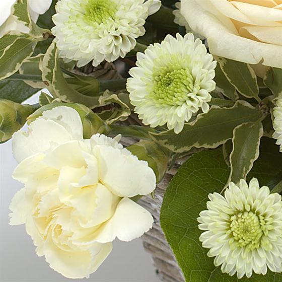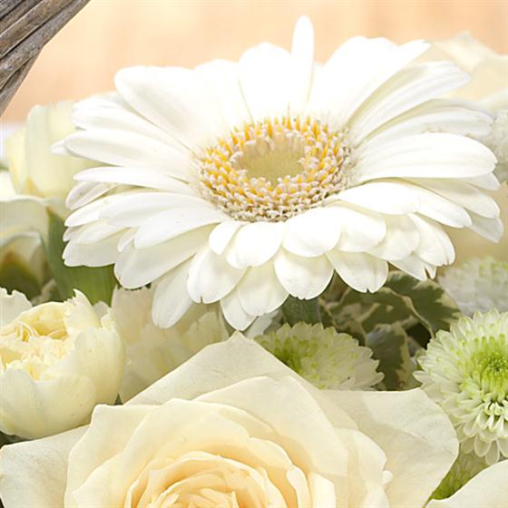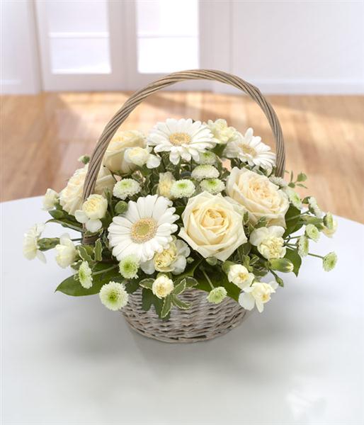 Calm , subtle and stylish . A white and cream basket arrangement of Roses, Germini, Carnations and Chrysanthemum and seasonal foilage ssuitable for gifting all occasions as well as sympathy . Offering great value for money , ease to maintain and great lngevity . Basket design may vary depending upon the season .