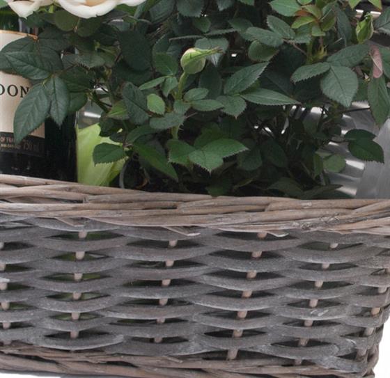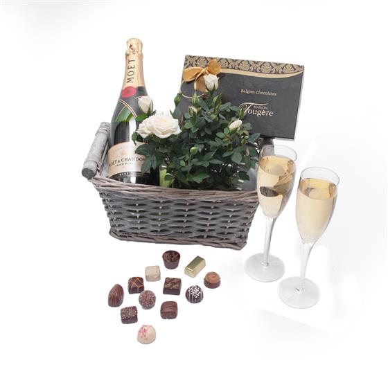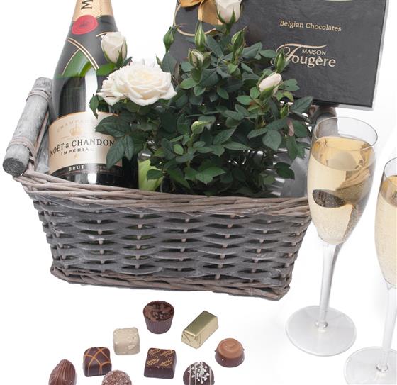 Moet and Chandon ( 75cl and 12% Al )is rightly among the world's most loved champagne. This exclusive brand dates back to 1743. With a perfect balance of Pinot Noir, Chardonnay and Pinot Meunier, Moët Impérial Brut offers a bright fruitiness, a seductive palate and an elegant maturity, revealing aromas of pear, citrus and brioche. By Appointment to Her Majesty Queen Elizabeth II Purveyors of Champagne Champagne Moët & Chandon Épernay. Presented in this rustic white grey washed basket along with the specially bred house rose plant and Fougere' Belgian Chocs 125g with individually created uniquley delicious centers. The recipient will feel truly spoilt.