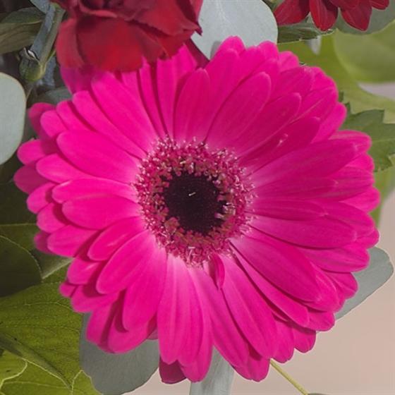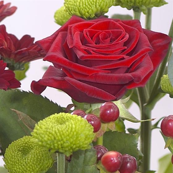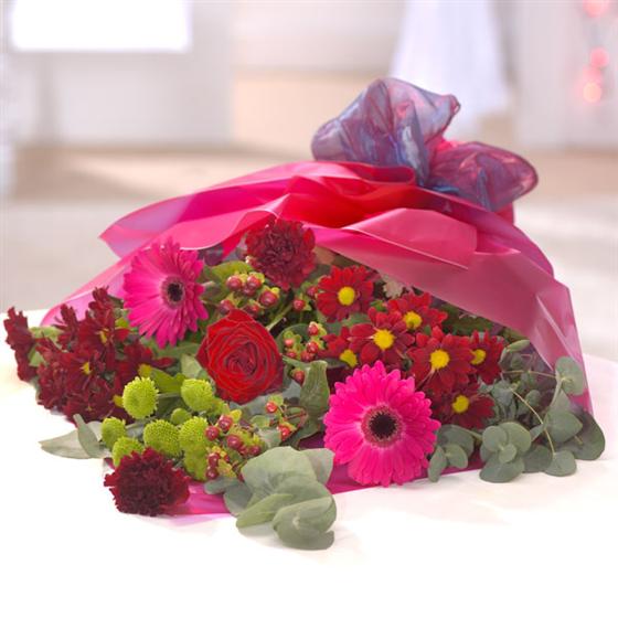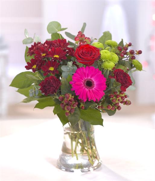 Romantic reds and burgundy are incorporated into this romantic bouquet including a red Rose, Gerberas, Carnations and Chrysanthemums. Vase not included but can be bought from our modern glassware selection to enhance the gift.