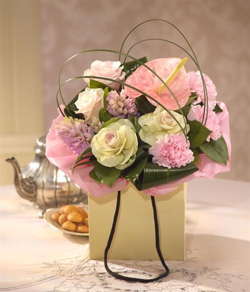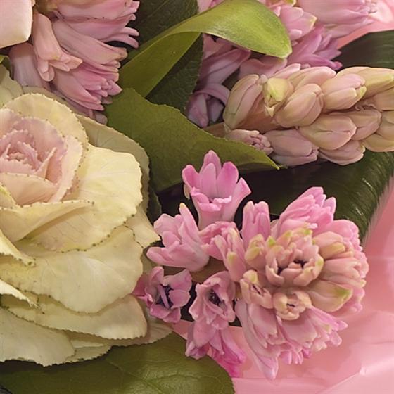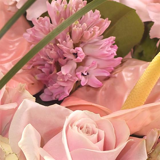 This modern fragrant design includes Brassica ( when available ) , Roses, Hyacinth, Carnations and exquisite Anthurium.
