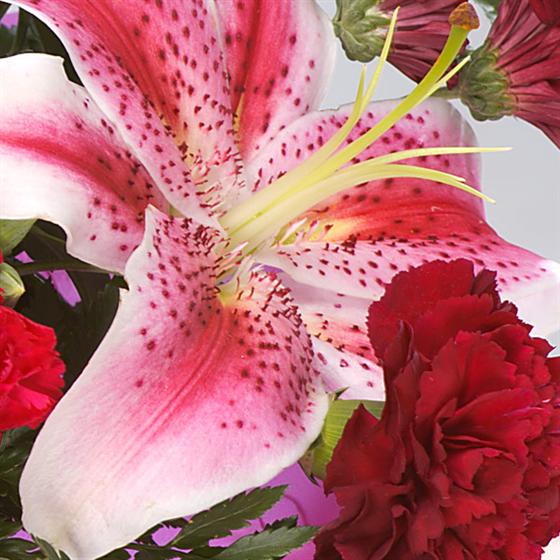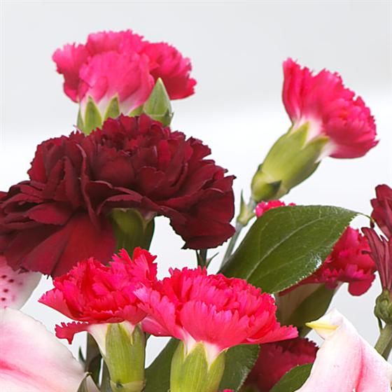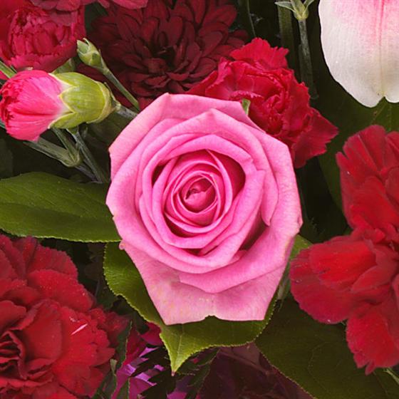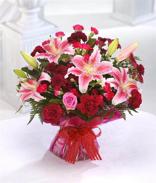 A sumptuous selection of flowers in rich reds, burgundy and pinks, featuring Lilies, Roses and Carnations, beautifully presented aqua hand-tied for the perfect gift.