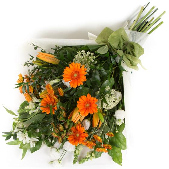 A striking selection of white and orange blooms including mini gerberas and lilies, presented as a traditional style bouquet.