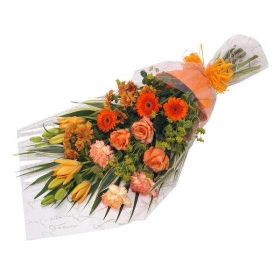 A Traditional bouquet in orange and lemon, roses, carnations, bulpleurum, germini and lilies.