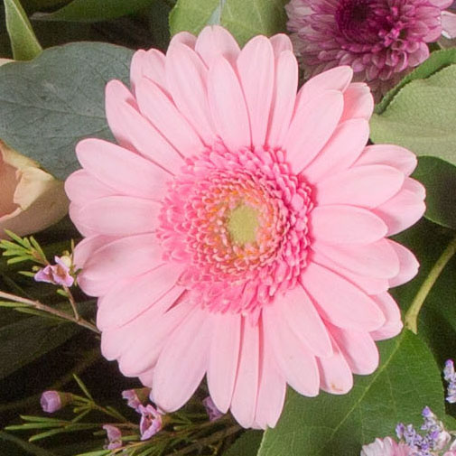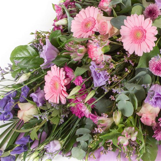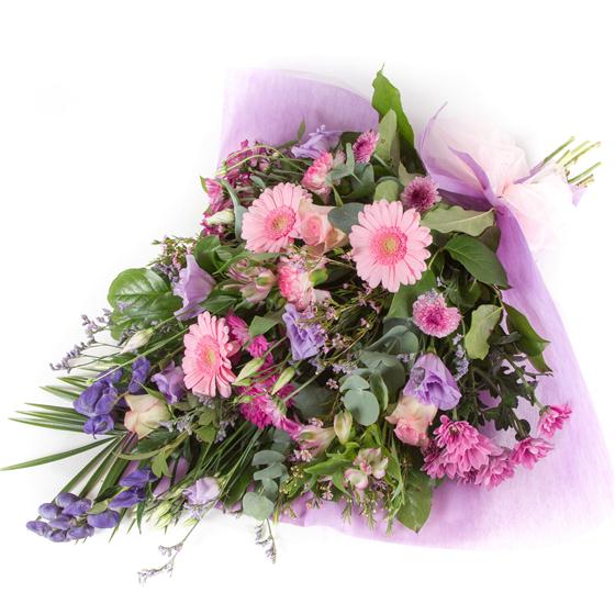 A pretty bouquet in lilacs and pinks including aconitum, carnations, gerberas, wax flower and complementing foliage. This is created as the picture and not delivered in a water bomb .