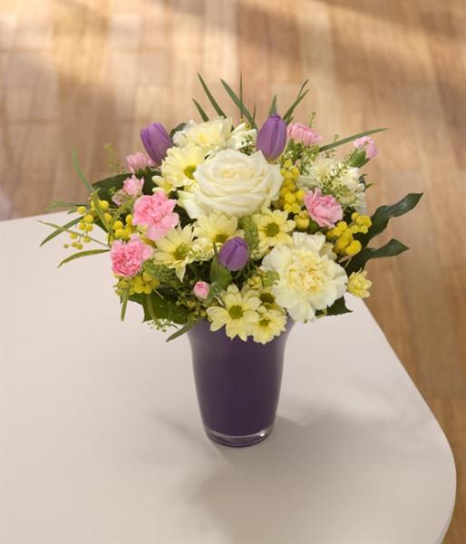 The soft and pretty pastel colours of this vase arrangement reflect the beauty of Spring. Lavender Tulips, cream Roses, pale blue Hyacinths and pink spray Carnations. Vase colours and style may vary depending upon availability .