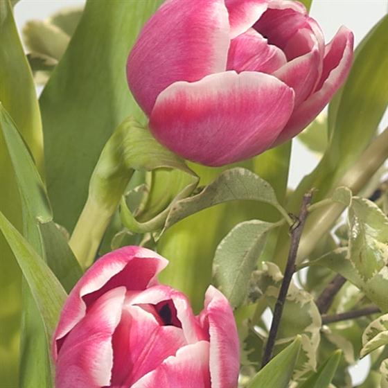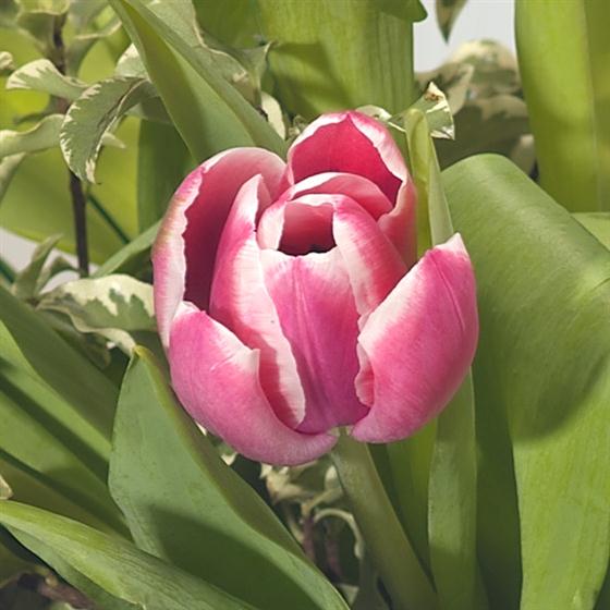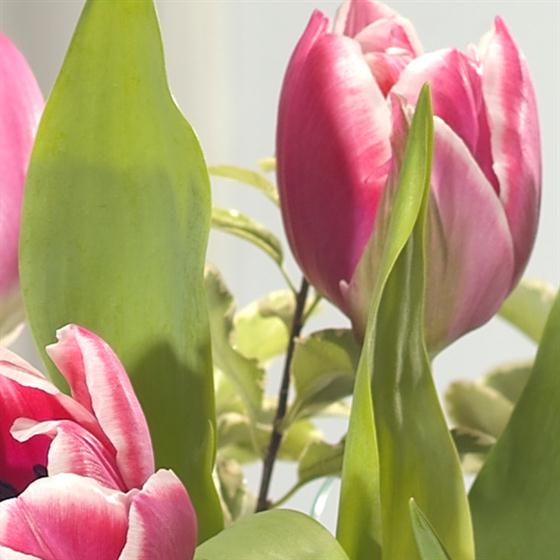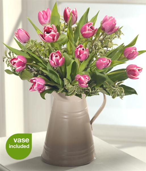 Quite simply an incredibly pretty combination of pink Tulips, variegated Pittosporum and Aralia leaves. Presented in a mushroom coloured zinc vase this spring flower bouquet requires no arrangement.