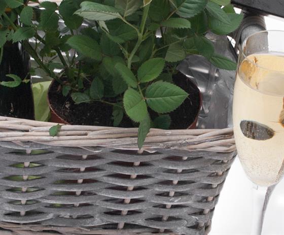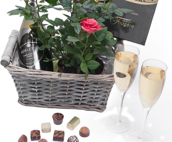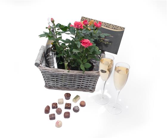 An attractive pink rose plant, Adeletto Prosecco 75cl and 11% Alc. wine and Fougere' Belgian chocolates 125g presented in a rustic woven white grey washed basket . That classic comination of Italian sparkling prosecco wine and chocolate. A lovely gift that the recipient will have memories for a long time after the chocolates and wine have been enjoyed . Should the rose plant be well tendered it may even be planted out side in late spring time . This may only be gifted to and received by an adult of at least eighteen years of age .