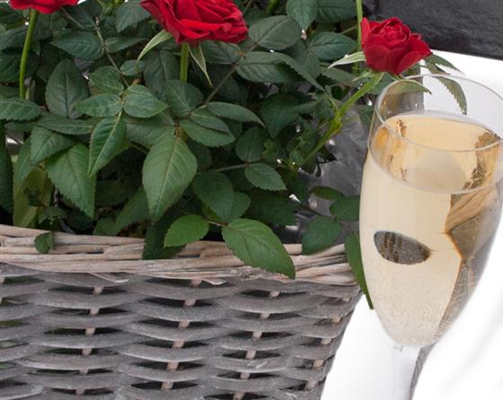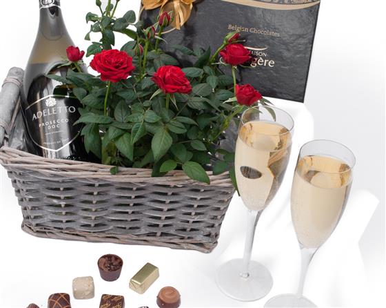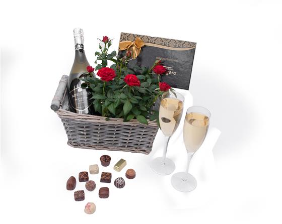 An attractive red rose plant, Adeletto Prosecco 75cl and 11% Alc. wine and Fougere' Belgian chocolates 125g presented in a rustic woven white grey washed basket . That classic comination of Italian sparkling prosecco wine and chocolate. A lovely gift that the recipient will have memories for a long time after the chocolates and wine have been enjoyed . Should the rose plant be well tendered it may even be planted out side in late spring time . This may only be gifted to and received by an adult of at least eighteen years of age .