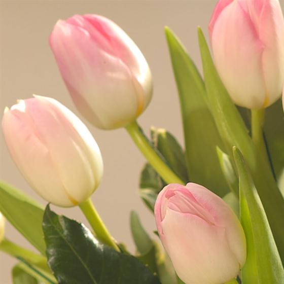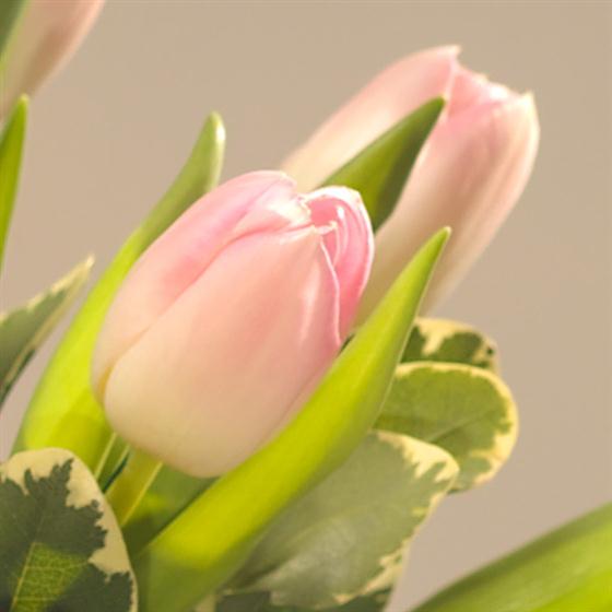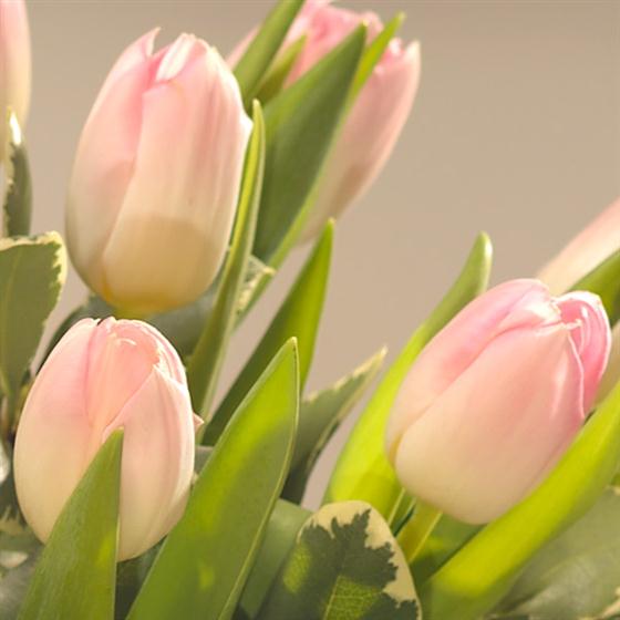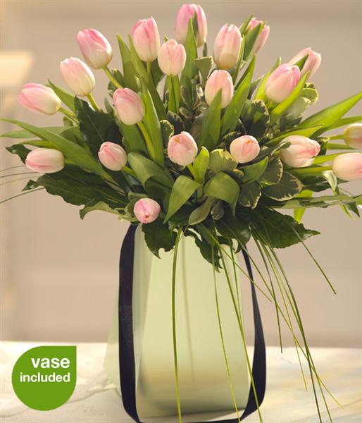 Soft pink Tulips lovingly arranged in a flower gift vase. Beautiful in its simplicity and stunning in design. A Mother's Day gift she's bound to love.