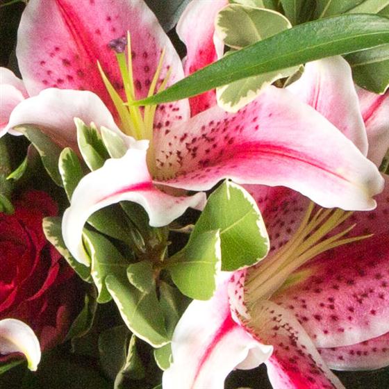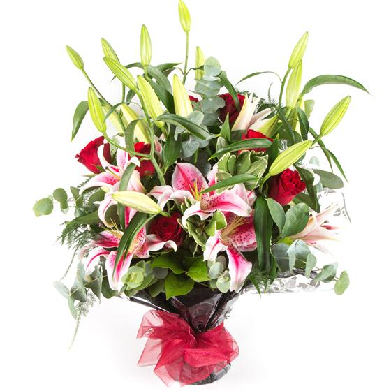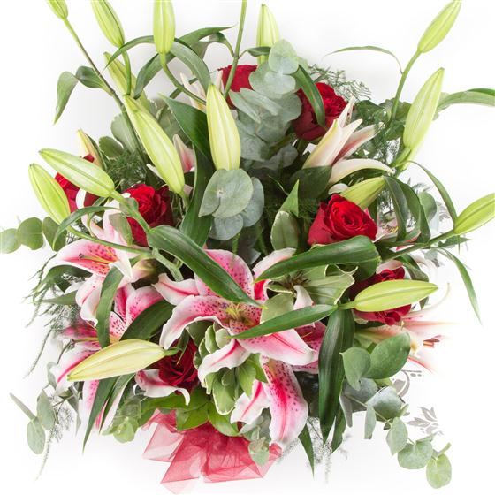 A highly scented, beautiful hand-tied bouquet of velvety red roses and stargazer lilies.