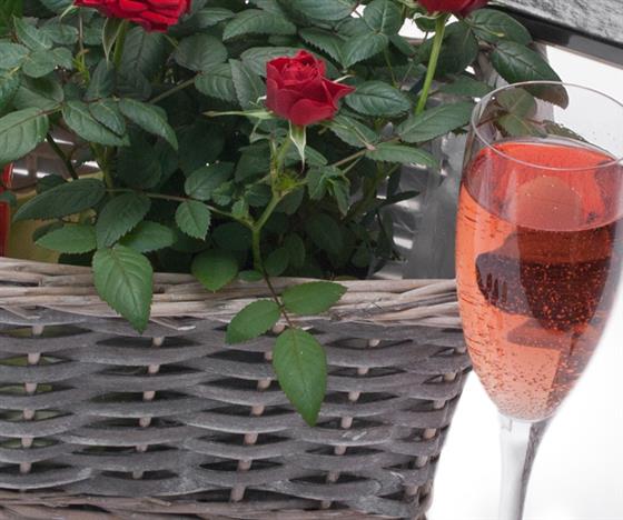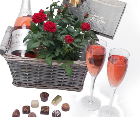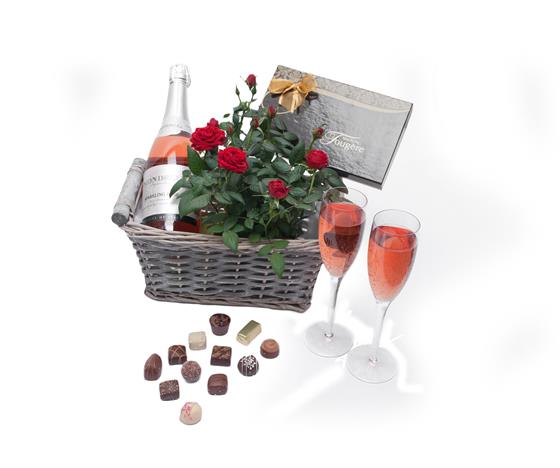 Mondelini Rosada sparkling rose' wine is fun and perfect for all celebrations. This lovely fizzy fun wine has a summery berry flavour 75cl and 7% Alc. Presented in this rustic white grey washed basket along with the specially bred house red rose plant and Fougere' Belgian Chocs 125g with individually created uniquely delicious centers surrounded by the smooth exotic flavour of this chocolatier's chocolate. The recipient will feel truly spoilt.