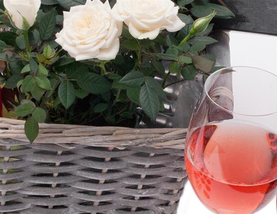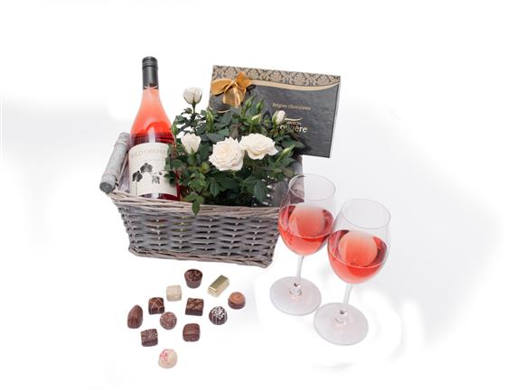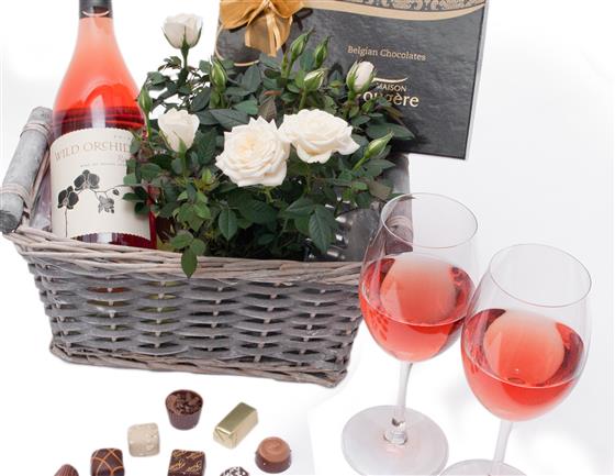 A lovely rose' wine from the boutique selection of Wild Orchid wines 75cl and 12% Alc. Always best served chilled and ideal for drinking as an aperitif or with meals. Presented in this rustic white grey washed basket along with the specially bred house rose plant and Fougere' Belgian Chocs 125g with individually created uniquely delicious centers surrounded by the smooth exotic flavour of this chocolatier's chocolate. The recipient will feel truly spoilt.