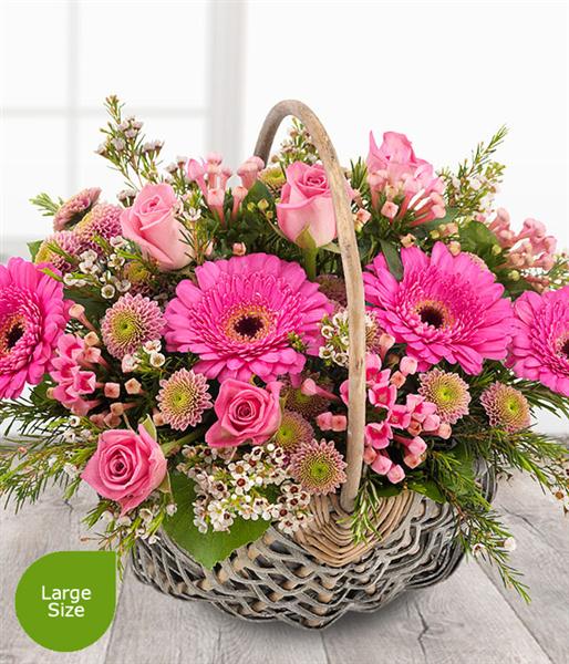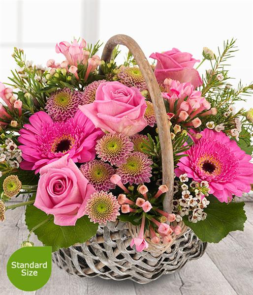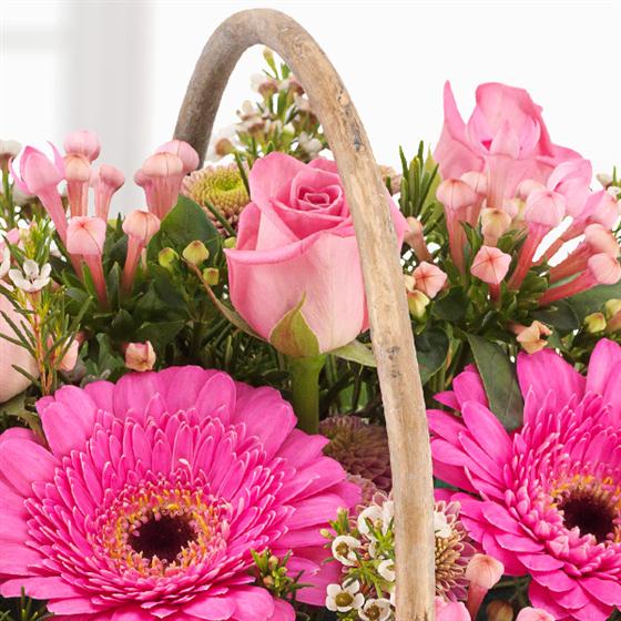 Includes Pink Roses, Pink Spray Chrysanthemums, Pink Bouvardia, Pink Germinis, Cream Wax Flower, Galax Leaf. Basket styles may vary depending upon availability .