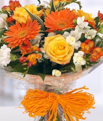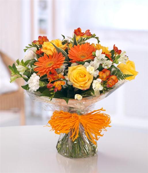 A hand-tied bouquet with mixed orange and white flowers including Roses, Gerbera, Freesias, Carnations, Gerbera, Chrysanthemums and Alstromeria. Beautifully packaged in an aquapack for instant display.