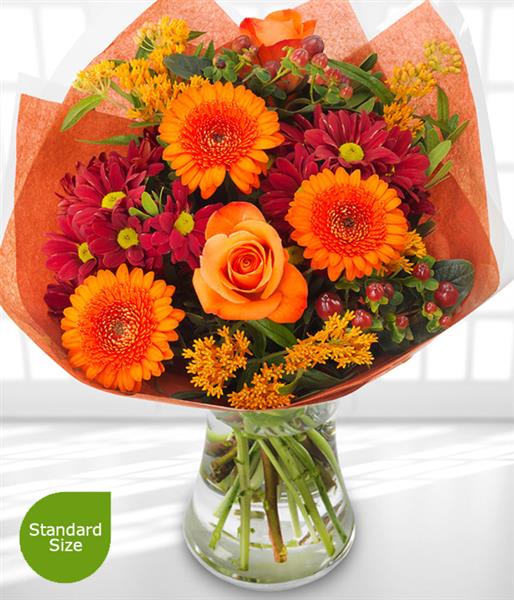 Send some cheer with this radiant bouquet of orange roses, orange germini, red chyrsanthemum and hypericum berries.