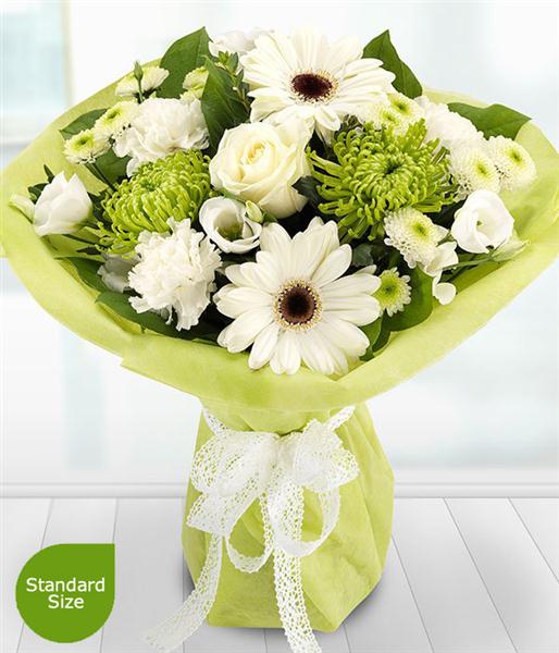Includes White Roses, White Gerberas, White Lisianthus, Green Chrysanthemums, White Spray Chrysanthemums, White Carnations, Eucalyptus, Salal.