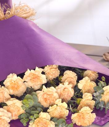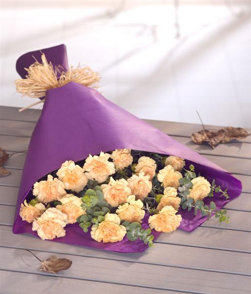 A purple wrap of orange Carnations. A simple yet stunning colour combination and created with complimenting seasonal foliage . If you wish for a mixed palette of carnations or this arrangement create in an alternative colour please advise . Carnations available in green, white, red , pink & lilac. Picture shows the medium selection .