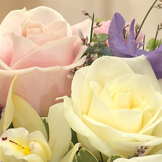 A fragrant delight of country style flowers, including white Roses, Cymbidium Orchid Heads, Freesias and pink Carnations delivered in a basket with a exotic yet soft and pastel appearance . Offers great longevity and value for money . The basket design may vary according to the season .