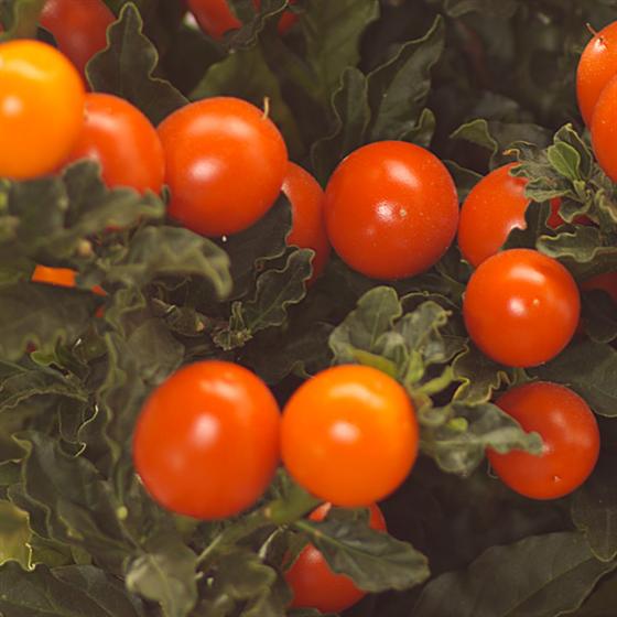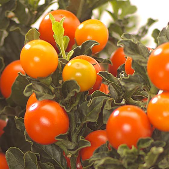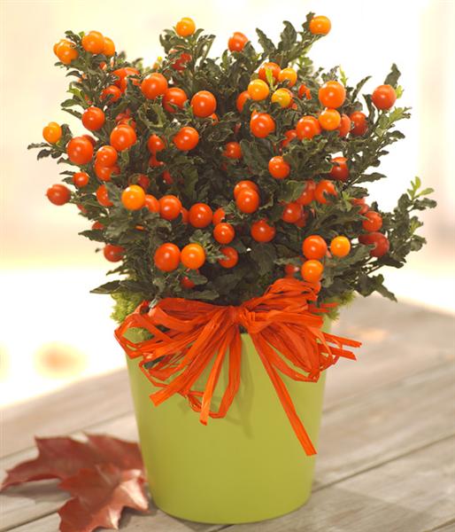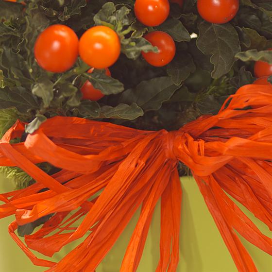 An orange Solanumn plant presented in a ceramic pot and finished with a raffia bow.